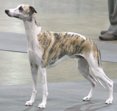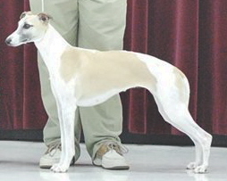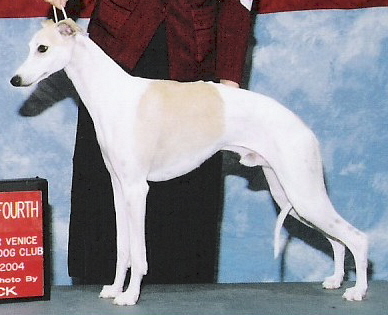 "JESTER" is a typy young dog with a great future. He won his class at the American Whippet Club Southern Specialty. He completed his championship at 13 months old with wins over top ranked champions, entirely breeder owner handled. His latest USA litter was born February 16, 2009 out of Ch Karasar's Artistry and there are THREE Champions from that litter so far. He was the first to complete his Championship from our outstanding ALL CHAMPION "J" litter. Jester was NUMBER ONE WHIPPET IN Japan for 2009 & 2010. Back in the USA, watch for him on a limited basis.