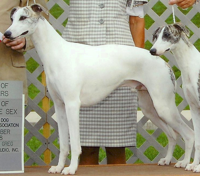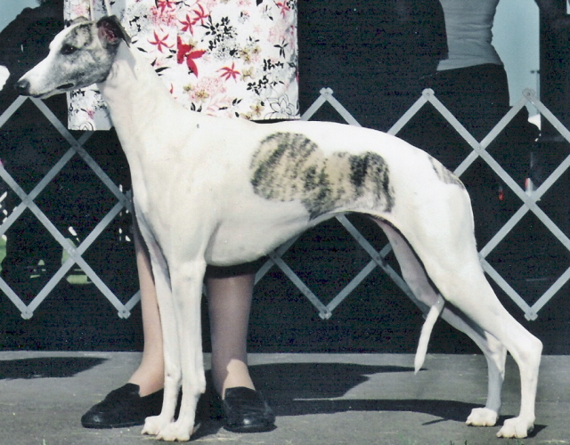 "Essence" is truly the essence of a Whippet. She is the product of a half brother/sister breeding on MBIS CH. Karasar's Preference and she is all one could have hoped for. She was a top ten whippet only shown a few months in 2004. She finished 2005 as the #2 Whippet in the country, and was a Top 5 Whippet for 2006. In her first litter she produced MBIS Ch. Karasar's Par Excellence. SHE IS OUR THIRD GENERATION MULTIPLE BEST IN SHOW WINNING AND ROM (Register of Merit Whippet, American Whippet Club) WHIPPET. THIS IS RECORD NOT ACHIEVED BY ANY OTHER WHIPPET BREEDER IN THE USA