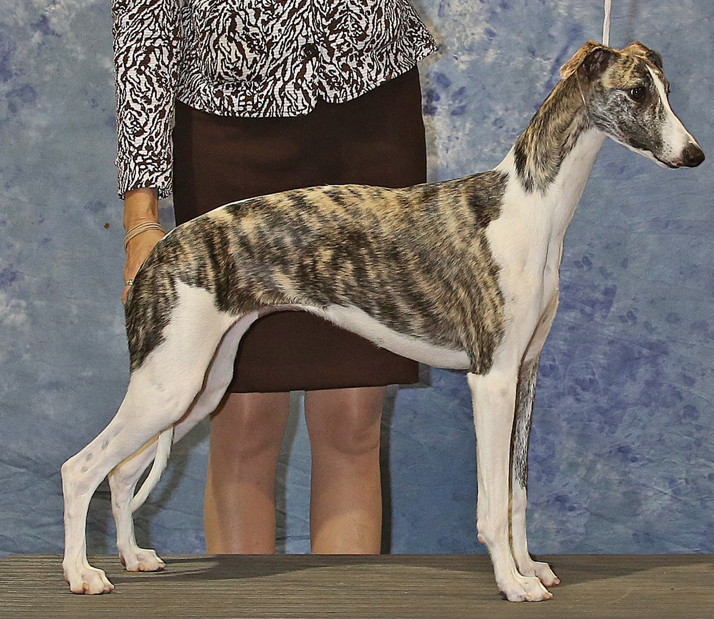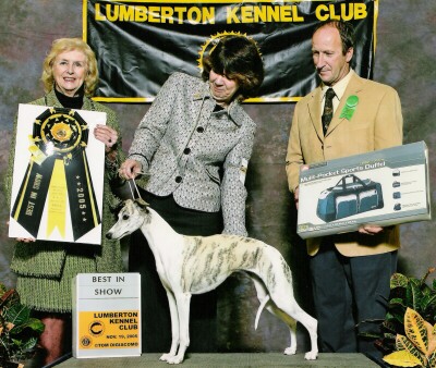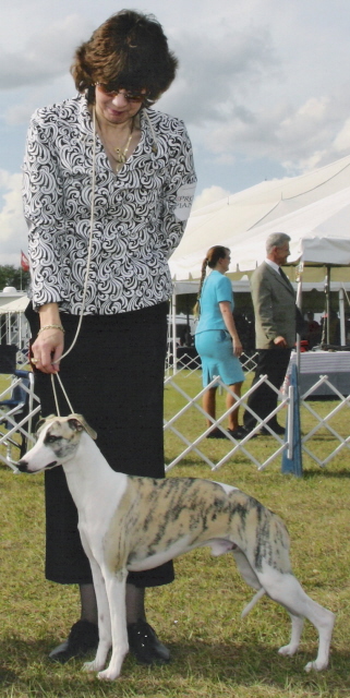 "Mandate" started off her show career with a bang, at 6 months of age, by winning both her Futurity and Regular classes at the 2006 American Whippet Club National Specialty. At 13 months of age, she finished her championship shown from the Bred By Exhibitor class. She is a Multiple Best of Breed Winner and Group Placer and Top 15 Whippet for 2007. She was owned by Wei Wei Chang in Taiwan.